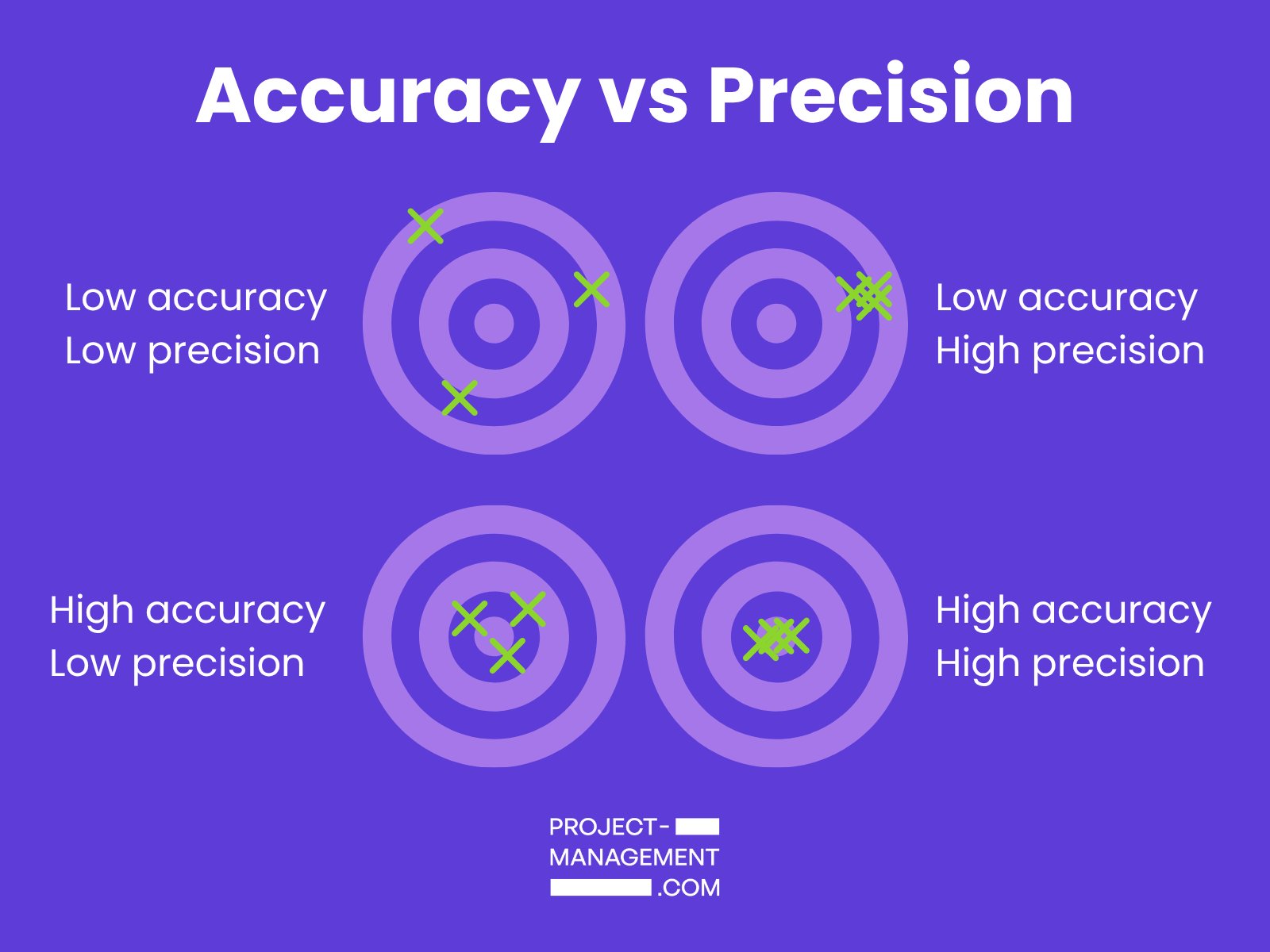 Low accuracy, low precision: Xs are widely distributed on a target. Low accuracy, high precision: Xs are close together, but not on the target’s bullseye. High accuracy, low precision: Xs are near the bullseye, but far from each other. High accuracy, high precision: All Xs are on the bullseye.