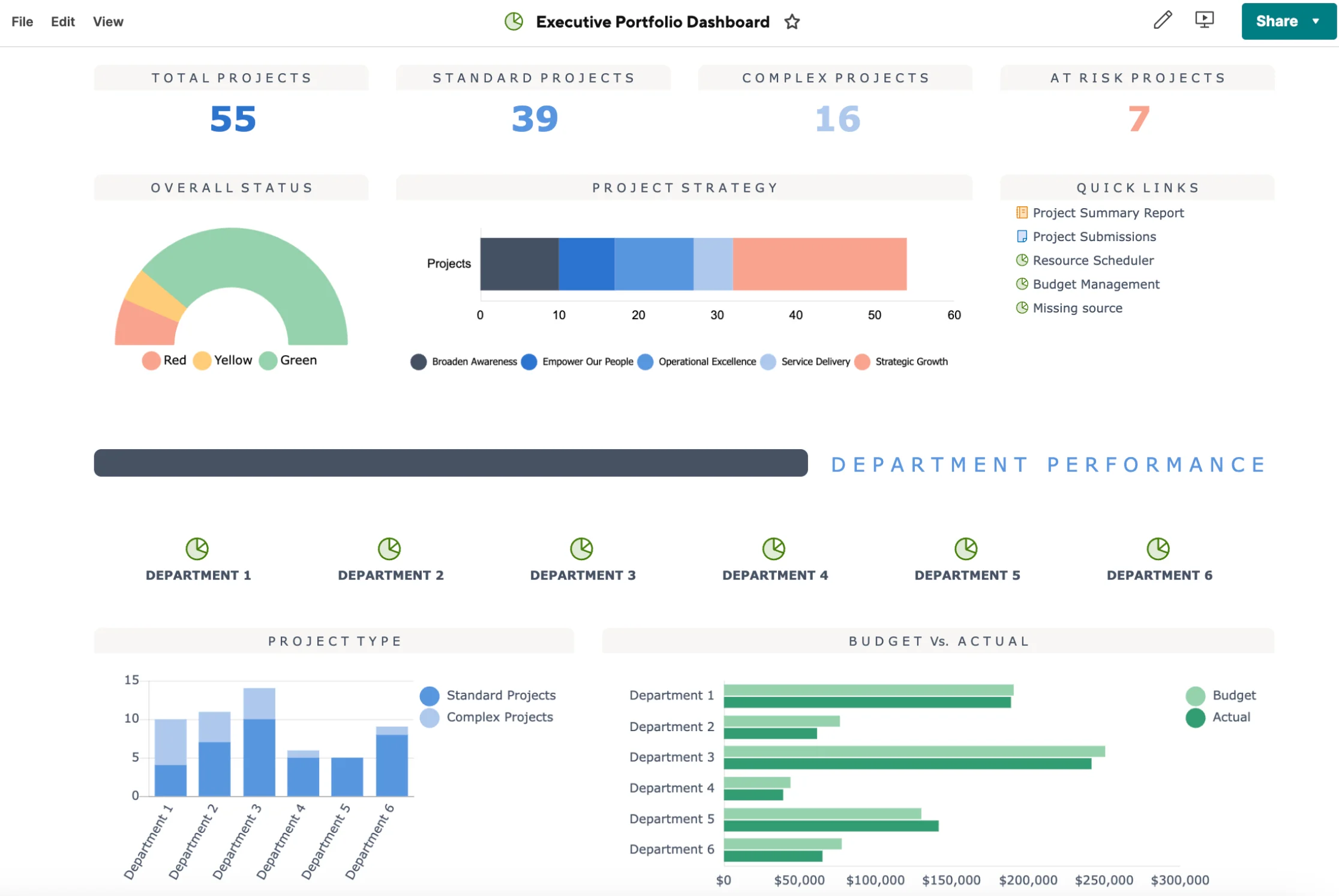 Smartsheet’s executive portfolio dashboard helps you monitor project performance in real-time by tracking project status, risk levels, and budget versus actual spending across departments.