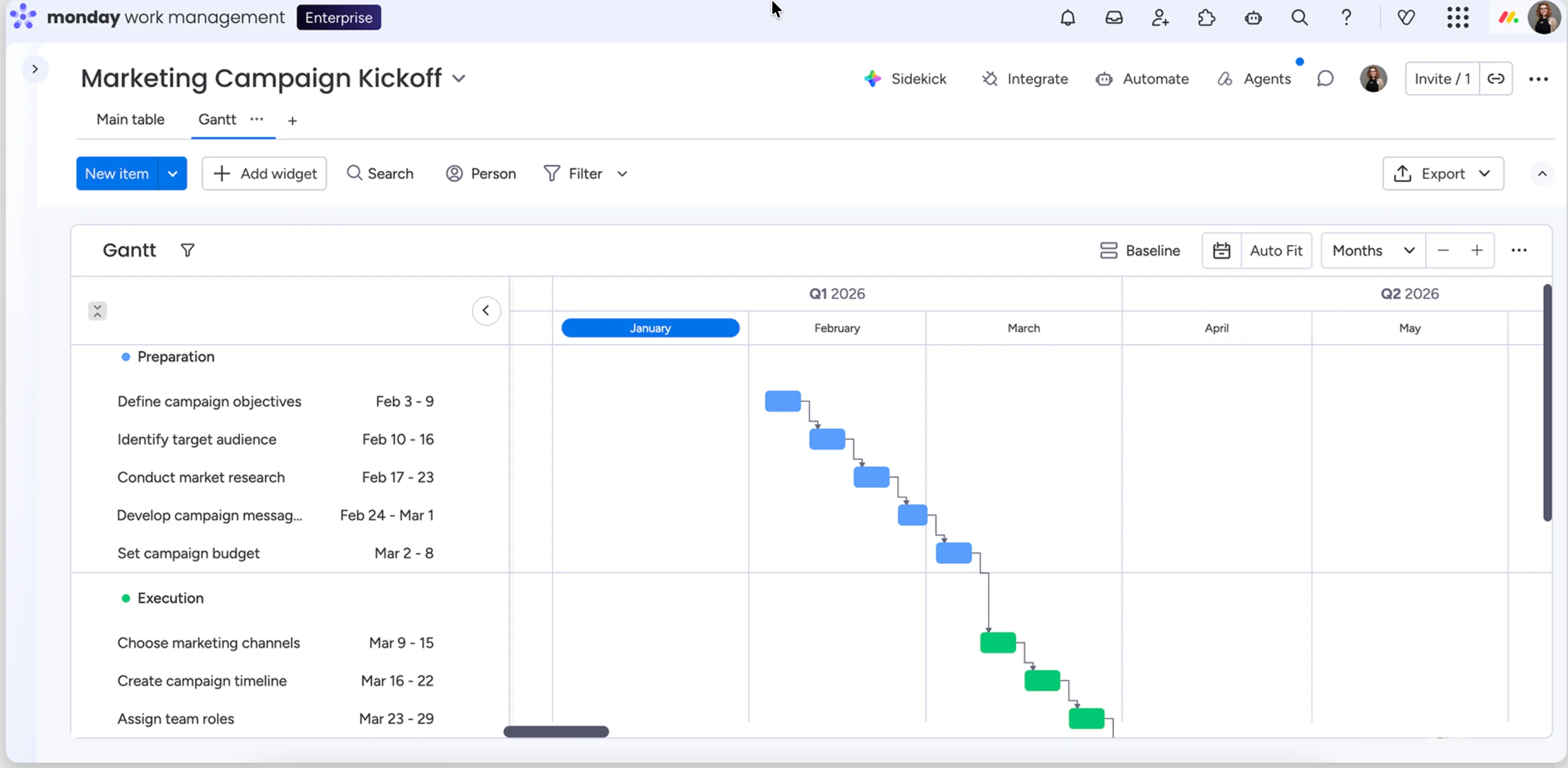 Plan and track campaign timelines with Gantt charts and task dependencies. (Source: monday.com)